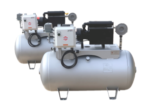 The pump is available with single phase or three phase motor. Standard accessories include vacuum gauge, regulator, particulate filter, exhaust silencer and support base.