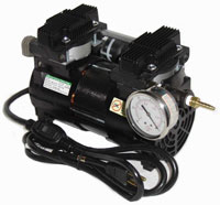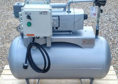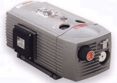 The DV series of pumps are 100% oil-less rotary vane vacuum pumps. They are designed to operate on a continuous basis at any point from atmospheric pressure to a vacuum level of 22.5—27′ Hg depending on the pump model. The oil-less pumps are ideal for applications where oil or water sealed pumps are objectionable. The pump come complete with an electric motor, inlet filter, base and/or vibration isolators and discharge muffler (as required). Made for pumping air only.
