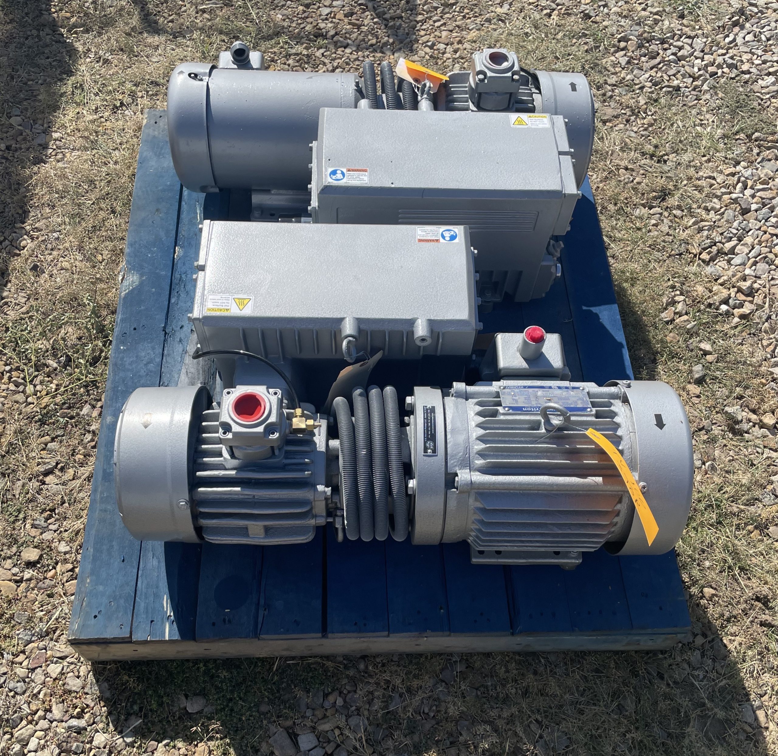 Reconditioned/PRE-Owned Vacuum Pumps All pumps come with 30 Day warranty unless otherwise noted ROTARY VANE US Vacuum TV40D (28 cfm), Rebuilt with NEW module. 90 Day warranty $ 2,800.00 US Vacuum TV100D (70 cfm), Rebuilt with NEW module. 90 Day warranty $ 4,000.00 US Vacuum TV63D (45 cfm), Rebuilt with 90 Day warranty. Year 2025 Model $ 3,300.00 US Vacuum TV100B, Rebuilt, Vacuum tested to 4 Torr. 30 Day warranty Price is EACH, Two available. $ 3,000.00 BUSCH RC-400: 300 CFM, 29+”Hg (2 Torr tested), Air-Cooled New Module and NEW Motor, basically a new pump. 90 Day warranty. Two (2) Available. $ 15,500.00 Busch RC-400: 300 CFM, 29″Hg, Air-Cooled (460v). Former rental unit Tubular stand and 460v Motor starter. Pump runs loud. 30 Day warranty $ 5,500.00 ROTARY PISTON (Heavy Duty) RP150S ROTARY PISTON Vacuum Pump. Low Profile. 150 cfm, 20 micron (0.020mmHg), 460v Starter. 1 Yr warranty 38 Run hours $ 18,500.00 LIQUID RING LRV800/FS2 Single Stage Liquid Ring Vacuum Pump. 800 cfm, 29″Hg Max Vac. NEW Pump: Overstock Bare Pump: Cast iron casing, 304SST impeller, Teflon mechanical seals. 1 Yr warranty $ 17,500.00 ROTARY SCREW (Dry Vacuum) $